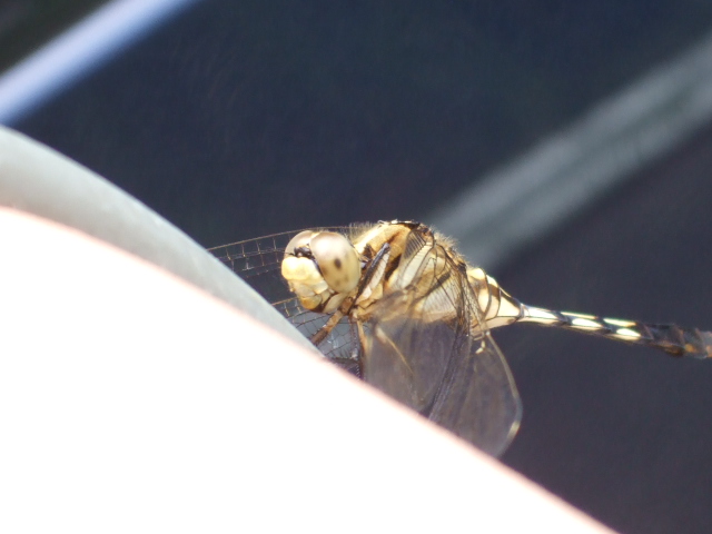 先日のこと、ある方が「カメラ!カメラ!」とおっしゃるのでデジカメを手にして近寄ってみますと、その方のヒザにトンボが留まっていました。