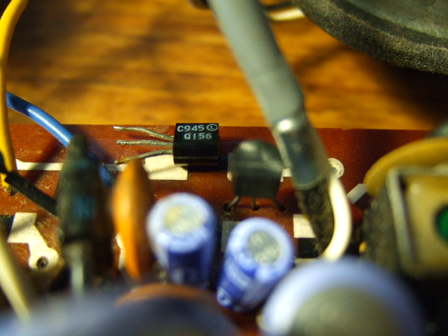 かすかながらちゃんとした音になってるということは、最後の増幅がうまく行ってない? ってことで外してみたんですが、テスタでちらっと見る限りトランジスタとしての動きはしてるみたい…増幅度が落ちるってあるんかなと思いながら、簡単に調べる手段がないのと面倒なのとで、手持ち(1000個ぐらいある?Hi)の2SC1815に交換してみたら…うるさいくらい大きな音で鳴るようになりました。