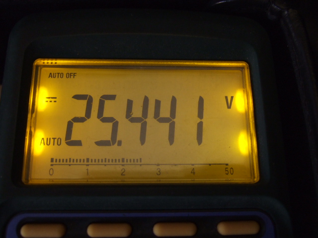 とっくの昔に校正が切れたテスタで見てみたところ、ご覧の数値。少し前に見たときは、26Vを超えたりする日もありました(ライン電圧によるんでしょう)…いやいやこれはイカンでしょ!