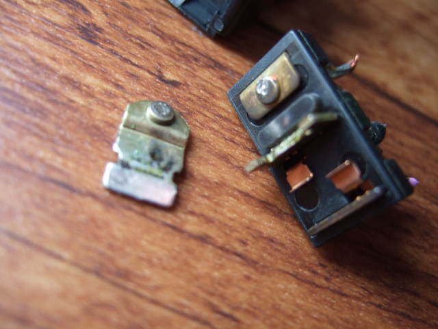 向学のために、壊れたスイッチの中を拝見。きれいに掃除すればまた使えそうな感じもありますが、ここの数百円をケチって火災とか目も当てられませんので、潔く破棄で。