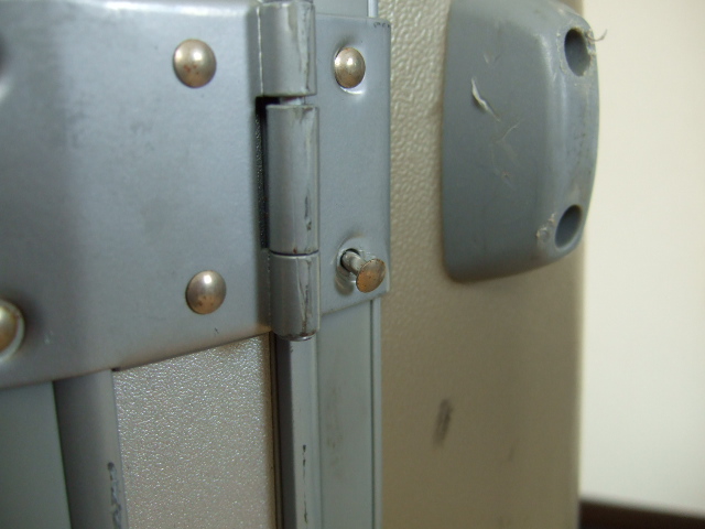 次は、上記にもちらっと出ましたが前回修理したこちら。帰ってきてふと見てみたら、蝶番部分のリベットが外れかけてます。外れてしまうとややこしいでしょうし、この状態でもすでに何かの拍子で怪我したりしそうなので