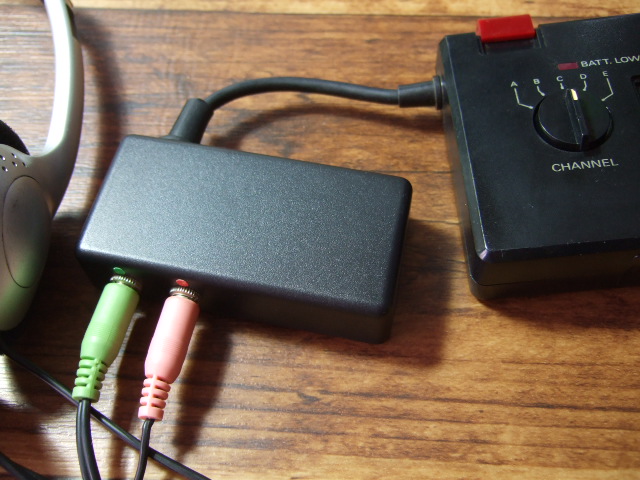 今では中古でしか入手できないこれらの個体。さすがにどんな経緯でやってきたのか分からないものを子供たちに使わせるわけにはいきません(過保護? Hi)。それで、元々のヘッドセットを取っ払ってしまい、市販のPC用ヘッドセットを接続するようにしてみます。アンテナは、試しに(市販のポケットラジオなどにならって)接続したヘッドセットのコードそのものを利用してみましょう。