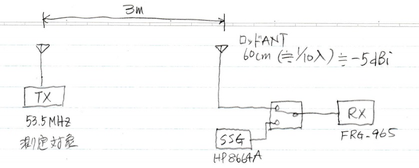ちなみにこれがどの程度なのかSSGと比較しながら見てみたら、33dBμVあたりでしたので、余裕も充分ありそう。対象機のアンテナは形状がいろいろ変わるのですが、めいっぱい伸ばして(一番効率が良くなりそうな形状にして)これでしたので、その点でもまあまあ安心です。