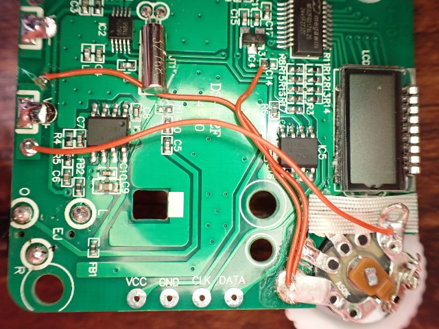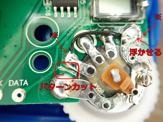 左側をパターンカット。右側は液晶が邪魔でパターンカットできないので、ハンダを外して接続部分を浮かせます。