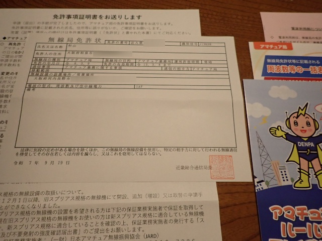 先日スプリアス確認保証を終えた局について、続いて手続きしてあった再免許が無事完了しました。