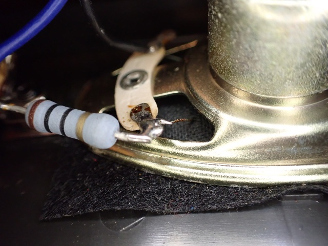 順序が前後しますが 2)についてはスピーカのボイスコイルのハンダが接続端子から外れてただけでしたので、付け直して完了。